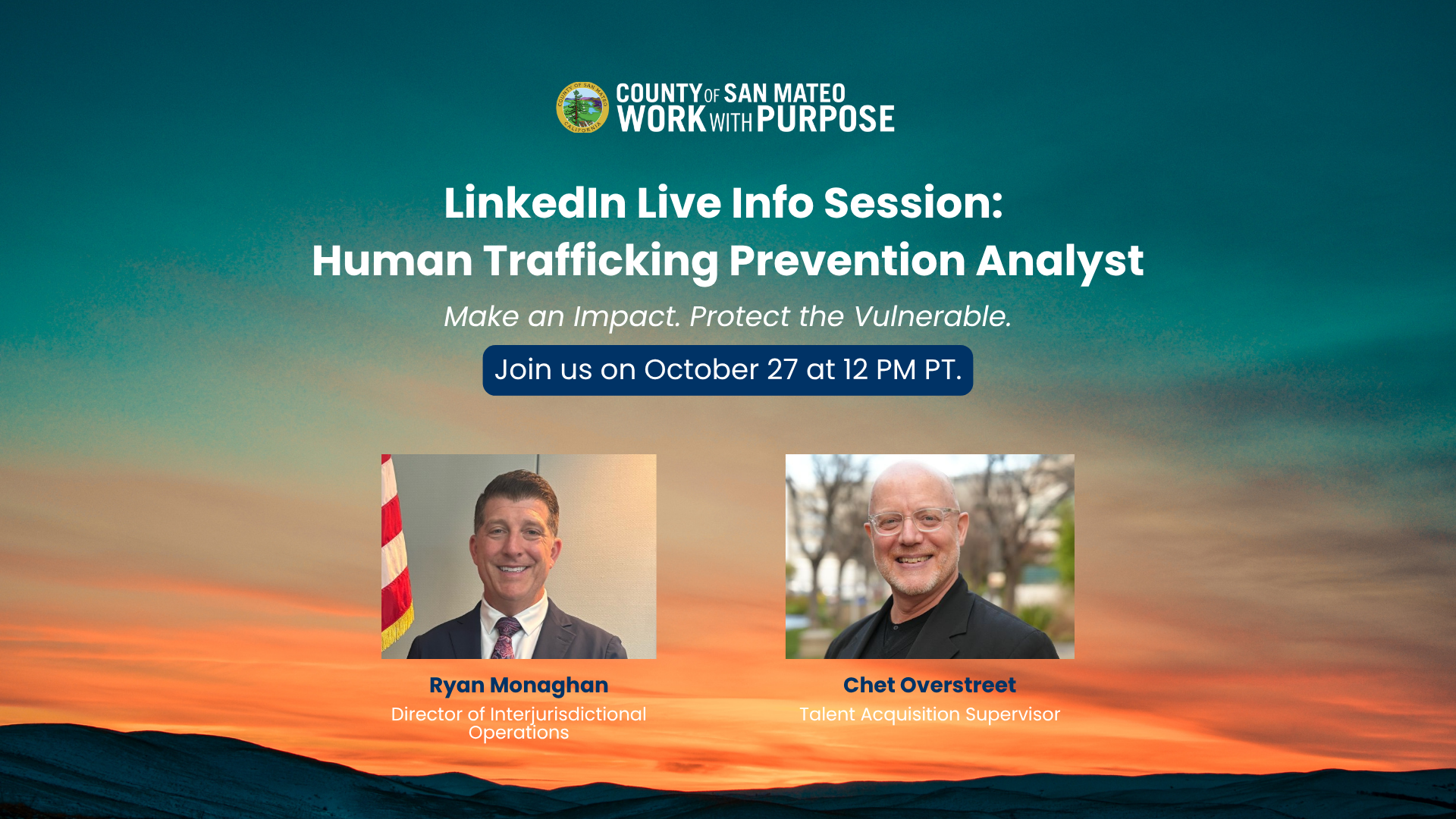 Join us for an informational session to learn about the Human Trafficking Prevention Analyst position with the County of San Mateo. This session will discuss the human trafficking prevention pilot program, the importance of the work, and the key responsibilities of the position. You will also gain insights into the ideal candidate profile and the recruitment and selection process.